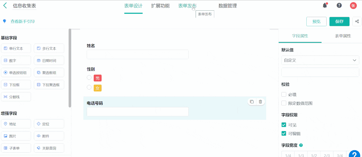 进入设计页面后,将要收集的信息字段从左侧拖到中间设计区,修改字段名称,并在右侧配置字段属性。