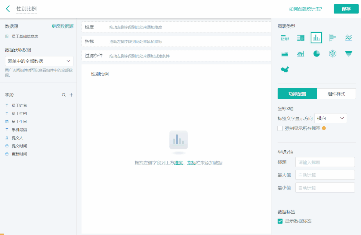 比如要统计性别比例,即需要选择左侧的【统计表】——【饼图】——添加员工性别至维度和指标。