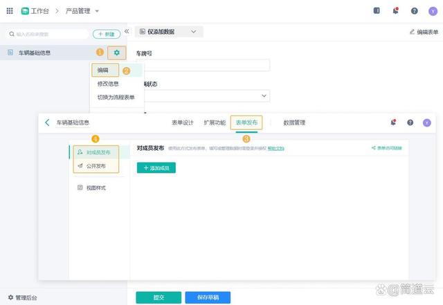 进入表单发布页面,选择需要设置权限的表单,在「设置 >> 表单发布」中,即可设置成员权限。