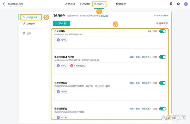 对成员发布:为企业内的成员设置数据权限,拥有权限的成员方可填报和管理数据 。