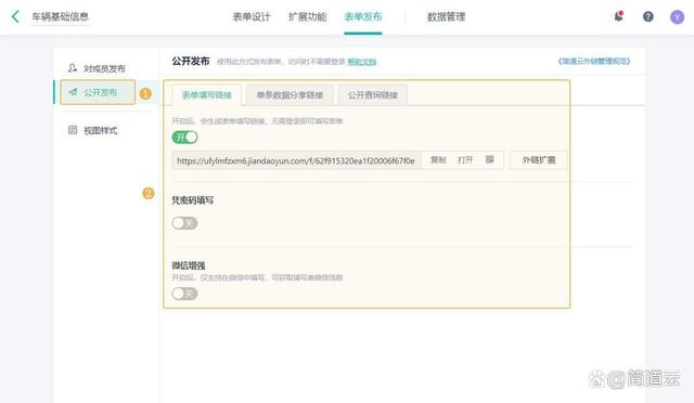 公开发布:发布给企业外用户,不需要加入团队即可完成数据的填报。但是可进行的操作有限,只能进行简单的数据填报、查询等操作。
