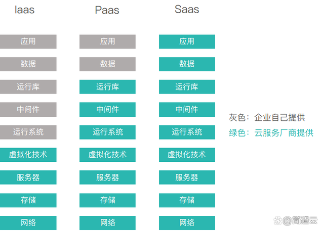 但并不是所有公司都会做这9个层次,不同的公司也会产生不同的软件需求,因此逐渐形成了三种主要服务形式:laas、Paas、Saas。区别在于哪些服务是云服务厂商提供、哪些是企业自己提供。