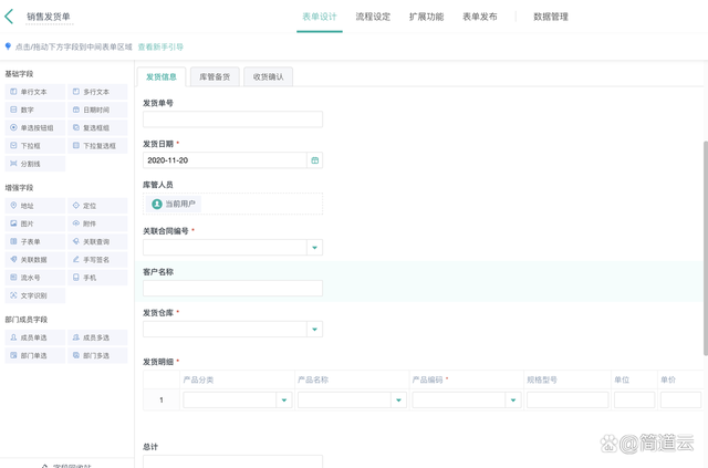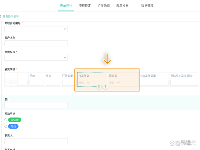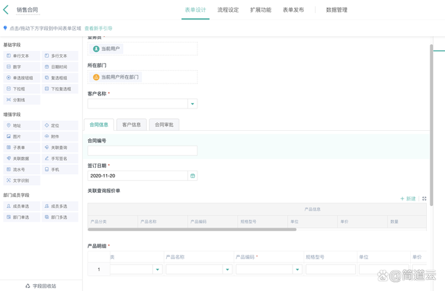 低代码平台搭建系统,将简单点就是利用好表单和流程表单,以及生成的数据。搭建之前先明确,销售过程需要:敲定价格、合同签订、发货退货以及库存统计。因此我们也需要设计这四类表单及流程表单,具体字段设计这里就不详细讲解。