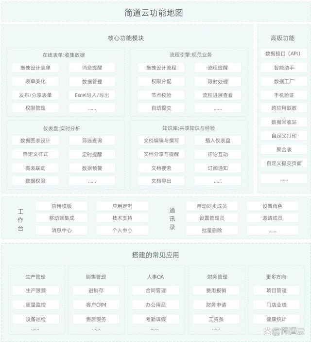 以简道云为例,我们可以看一款零代码平台会提供哪些具体的功能: