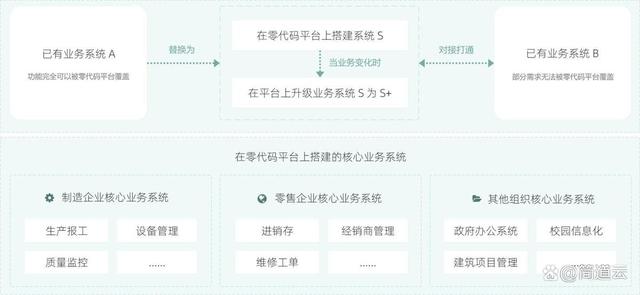 通过零代码平台,可以搭建出新的管理系统(后续业务发生变化时,直接在线升级迭代即可)。但同时,如果企业已经有的业务系统,可以考虑直接用零代码平台取代,也可以直接打通老业务系统和零代码系统之间的数据。