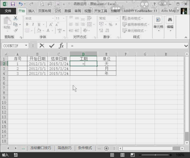 笔者先简单解释下以下表格中的单元格D2输入的公式“=DATEDIF(B2,C2,”d”)“前两个参数分别是开始日期和结束日期,第三个参数”d”是计算天数的参数,也可以改成”m”(计算月份)和”y”(计算年份)。