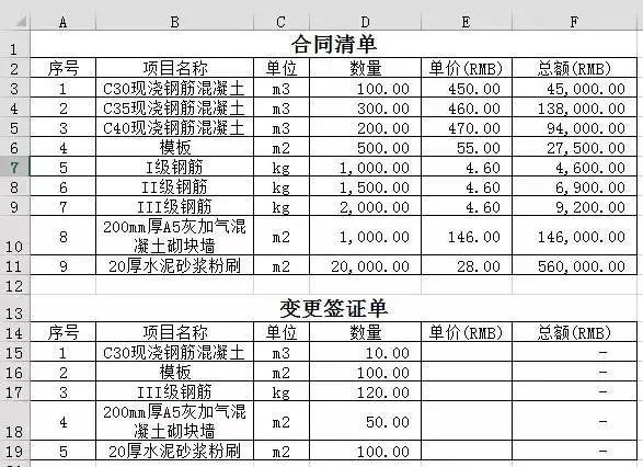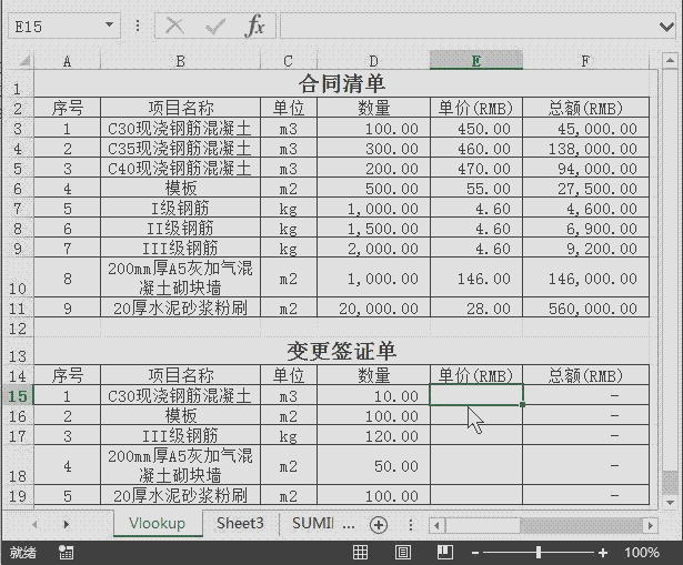 例如:施工单位在进行投标报价时,有很多单体工程分不同的清单表格进行报价,而其实大部分的清单项目是相同的,在完成第一个单体工程的投标报价后,再运用此函数在其他单体清单中,可达到了事半功倍。又如某个变更签证要参照工程合同(工程量清单为计价合同)的相应清单项目进行套价: