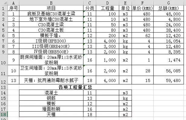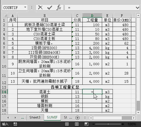 大家在统计工程量的各项技术指标时,往往先需要汇总各项工程量(如混凝土的总和),该项工作特别麻烦,还容易出错,有什么方法可以一步到位呢?常用函数Sumif可以帮大家解决这个问题。案例如下: