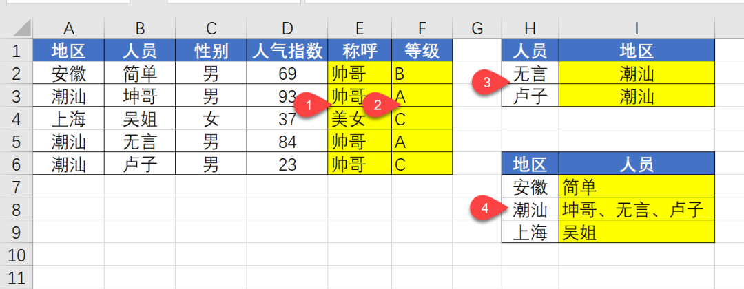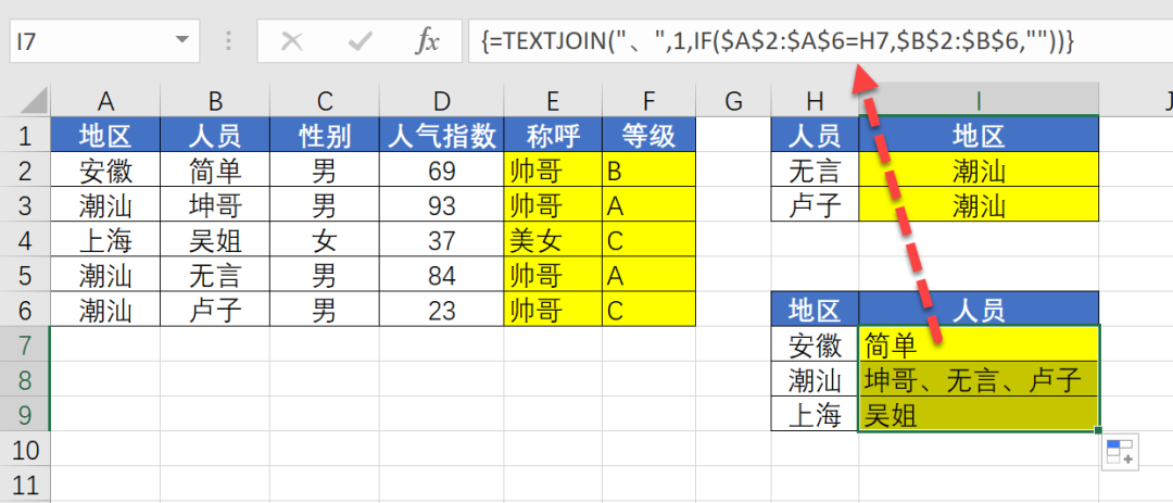 4.根据地区查找所有人员,并在一个单元格用顿号隔开。