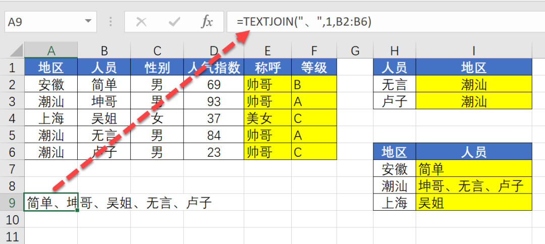 这里再举个例子来说明这个TEXTJOIN函数,将所有人员合并起来。