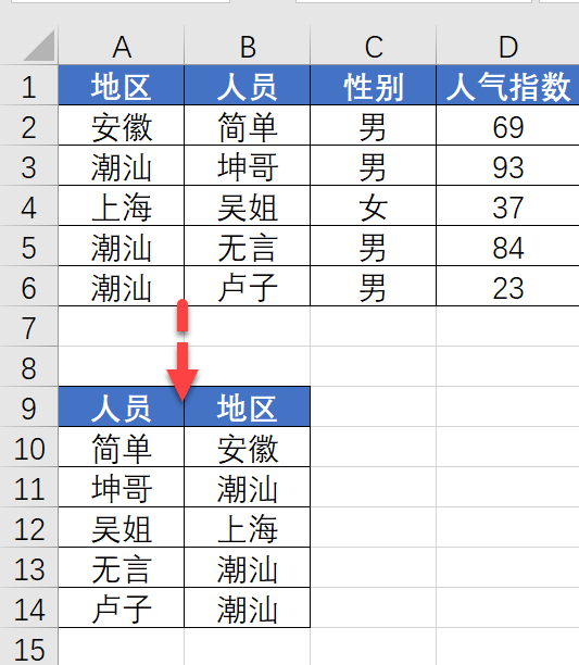 IF函数的作用就是重新构造一个区域,1代表左边的区域,0代表右边的区域,这里相当于将人员和地区顺序调换。