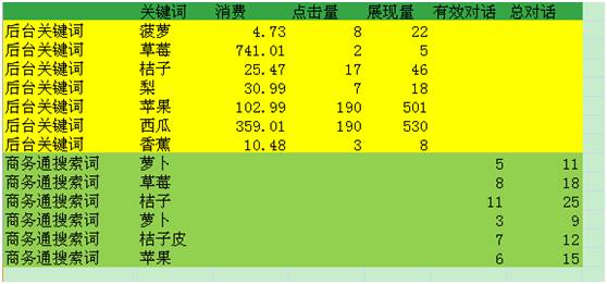 首先,我们只选择需要的数据,把两个表的数据放在一个表里。黄色的代表后台的数据,绿色的代表商务通的数据。数据这样子来放: