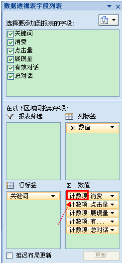 然后数据透视表中右侧,把字段里面的关键词拖到行标签,把字段里面其他的项全拖到数值里面。