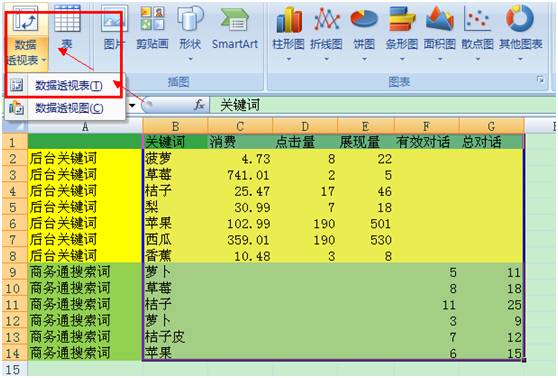数据透视表是一种可以快速汇总大量数据的交互式方法。如果两个数据表中含有一列相同属性的值,就可以用数据透视表把这两个数据表的数据综合起来。拿我们竞价数据来说,本文从后台和商务通分别下载关键词报告和搜索词报告,那么这两个表中关键词和搜索词是具有相同属性的,就可以把这两个表里的数据利用数据透视表来综合起来。