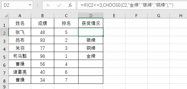 公式:D2=IF(C2<=3,CHOOSE(C2,”金牌”,”银牌”,”铜牌”),””)