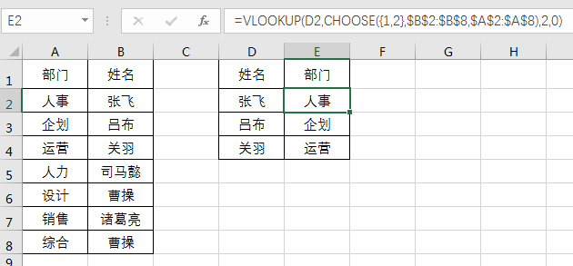 CHOOSE({1,2},$B$2:$B$8,$A$2:$A$8)意思是将B列的数据和A列数据对换位置,然后用vlookup函数进行正常查找。其实vlookup函数通常是只能从左向右查找,无法从右向左。我们通过choose函数实现换位,然后用vlookup函数进行查找就能实现反向查找。