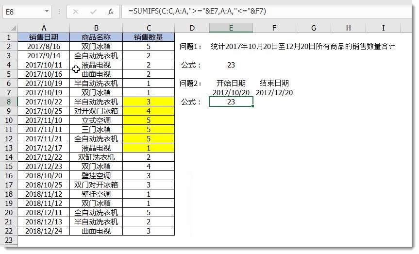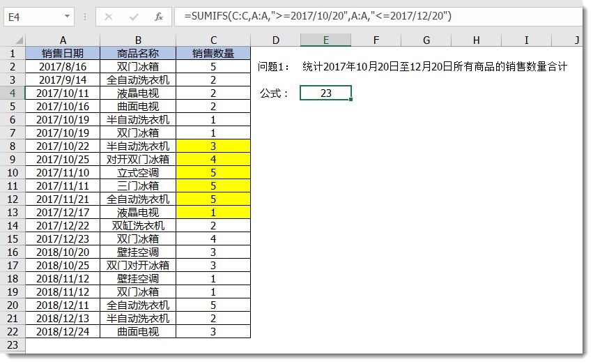 例如要统计2017年10月20日至12月20日所有商品的销售数量合计,其实就是对销售日期大于或等于2017年10月20日,同时销售日期小于或等于12月20日的数据作为求和的条件,再将对应的销售数量求和。