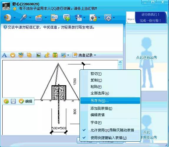 选“另存为…”,保存为.gif或.jpg格式即可,然后关闭QQ聊天窗口即可: