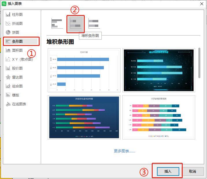在“插入图表”的弹出框,点击“条形图”,选择“堆积条形图”后点击“确定”;