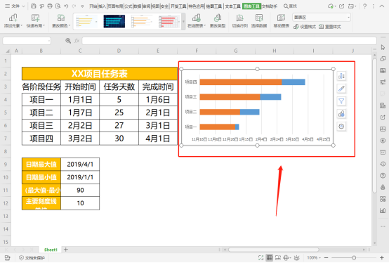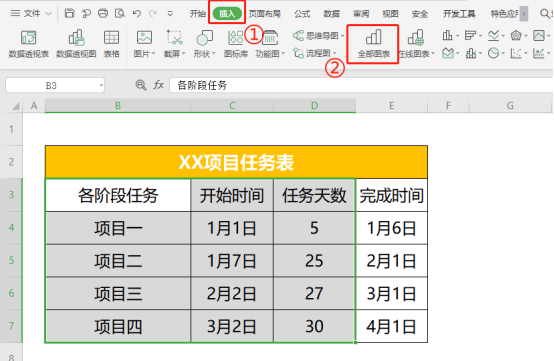 选中各阶段任务,开始时间,任务天数的数据,依次点击“插入”—“图表”;