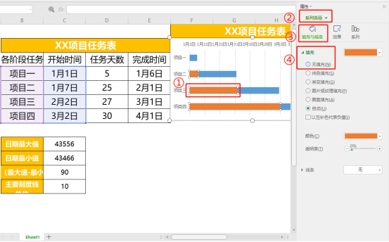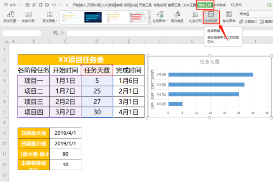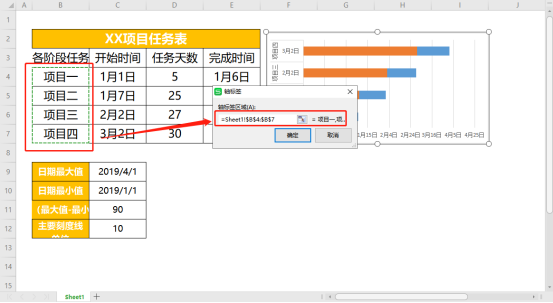 (例:这里需要将普通的项目计划表制作成甘特图,则准备任务名称、开始时间、任务天数、日期的最大值、最小值、差值和主要刻度线单位等数据)