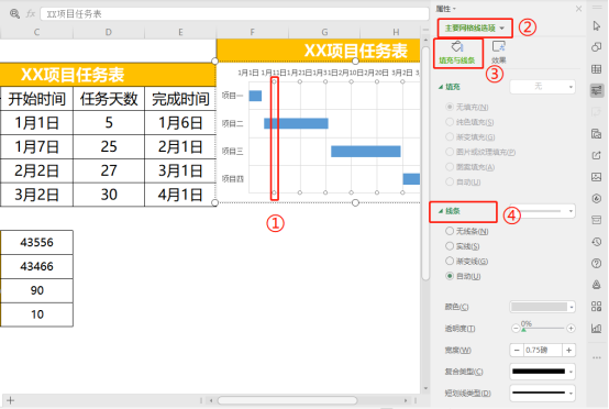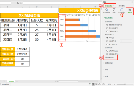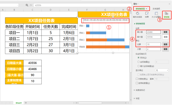 双击上方坐标轴,依次点击“坐标轴选项”—“坐标轴”。填入准备好的日期最小值、日期最大值、差值,调整坐标轴合适时间间隔;