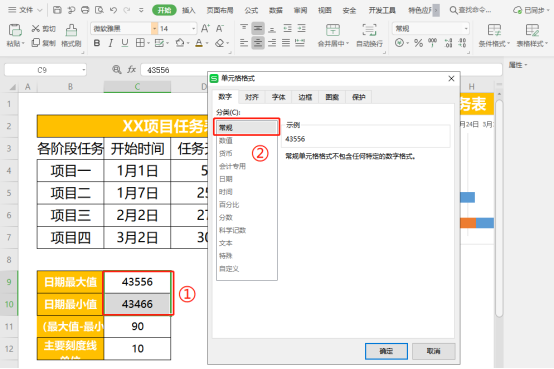 设置“日期最大值”和“日期最小值”两个单元格格式为“常规”;