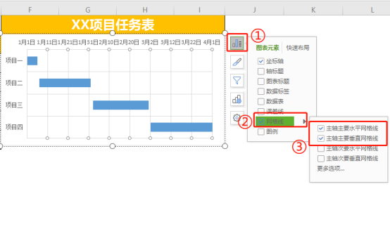 双击网格线,在图表右边出现的小工具内点击“图表元素”。依次选择“网格线”—勾选“主轴主要水平网格线”和“主轴主要垂直网格线”;