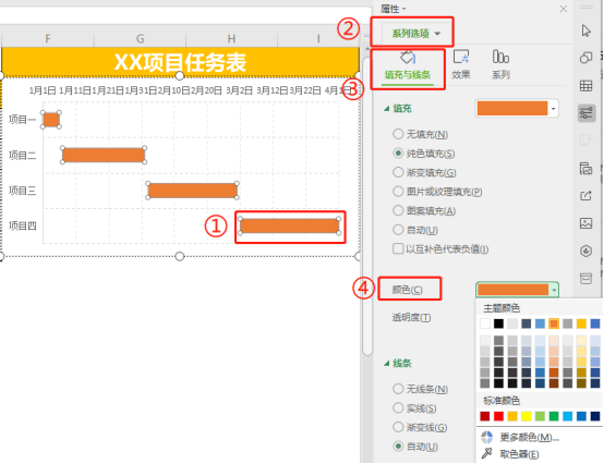 双击条形图,在右侧“系列选项”中选择“填充与线条”,调整你需要的“颜色”;
