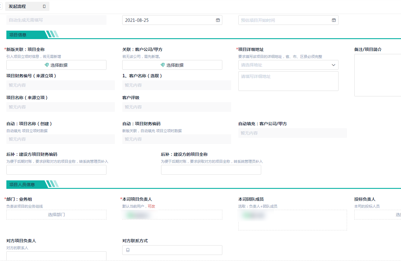项目管理分立项和创建两个阶段,在洽谈或投标期间进行立项申请,中标后进行项目创建并与财务部门等自动同步,项目基本信息完成固化后确定项目管理团队和负责人,公司按项目制进行单独管理。