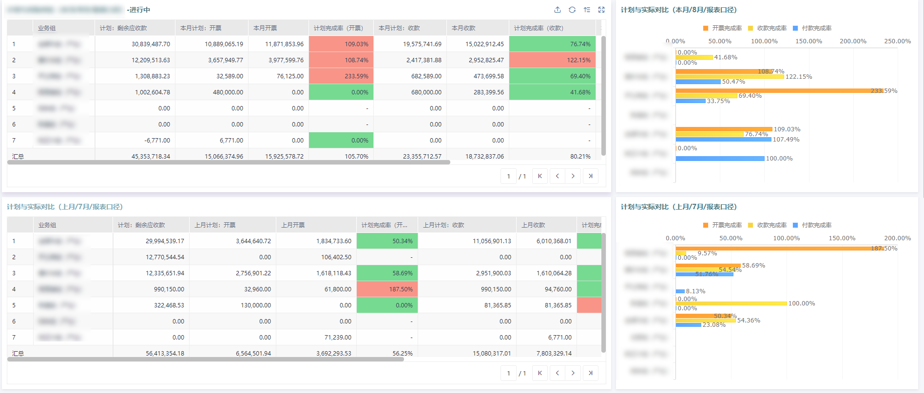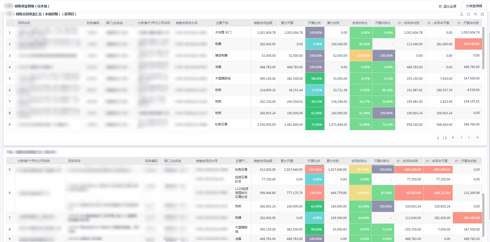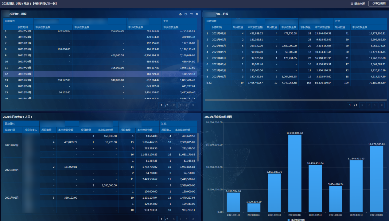 现在使用简道云建设了很多仪表盘,各种流程数据和台帐报表,系统自动生成报表,开会汇报打开系统都一目了然,我们终于有了传说中的管理驾驶舱,就算只是雏形,也节约了很多时间,提升了工作效率。”按公司整体、各部门管理所需、具体岗位职责等不同需求开发不同口径的报表,通过系统聚合表、数据工厂实时关联各类合同、收款、付款、发票、费用流程数据,自动生成各种口径和纬度的数据结果,按部门和业务组推送各类公用和专用报表。