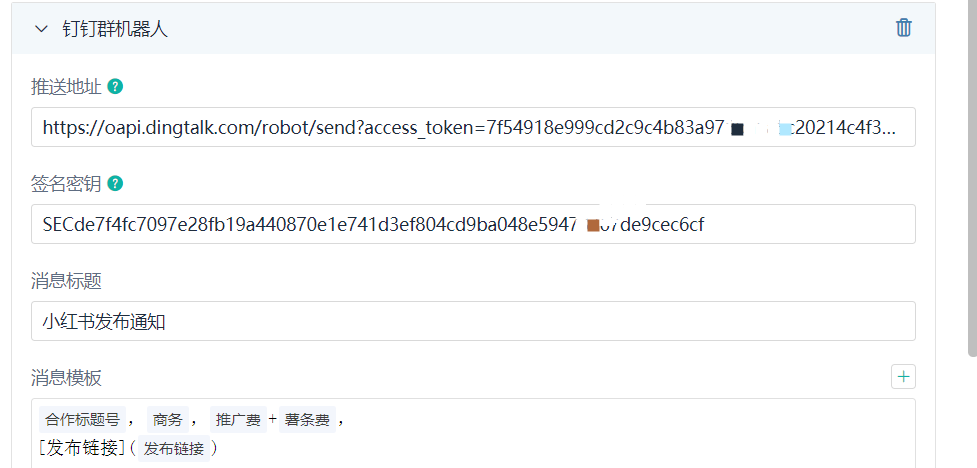能。采用钉钉群智能助手。在钉钉群内设置好机器人,将密钥、推送地址添加到智能助手处: