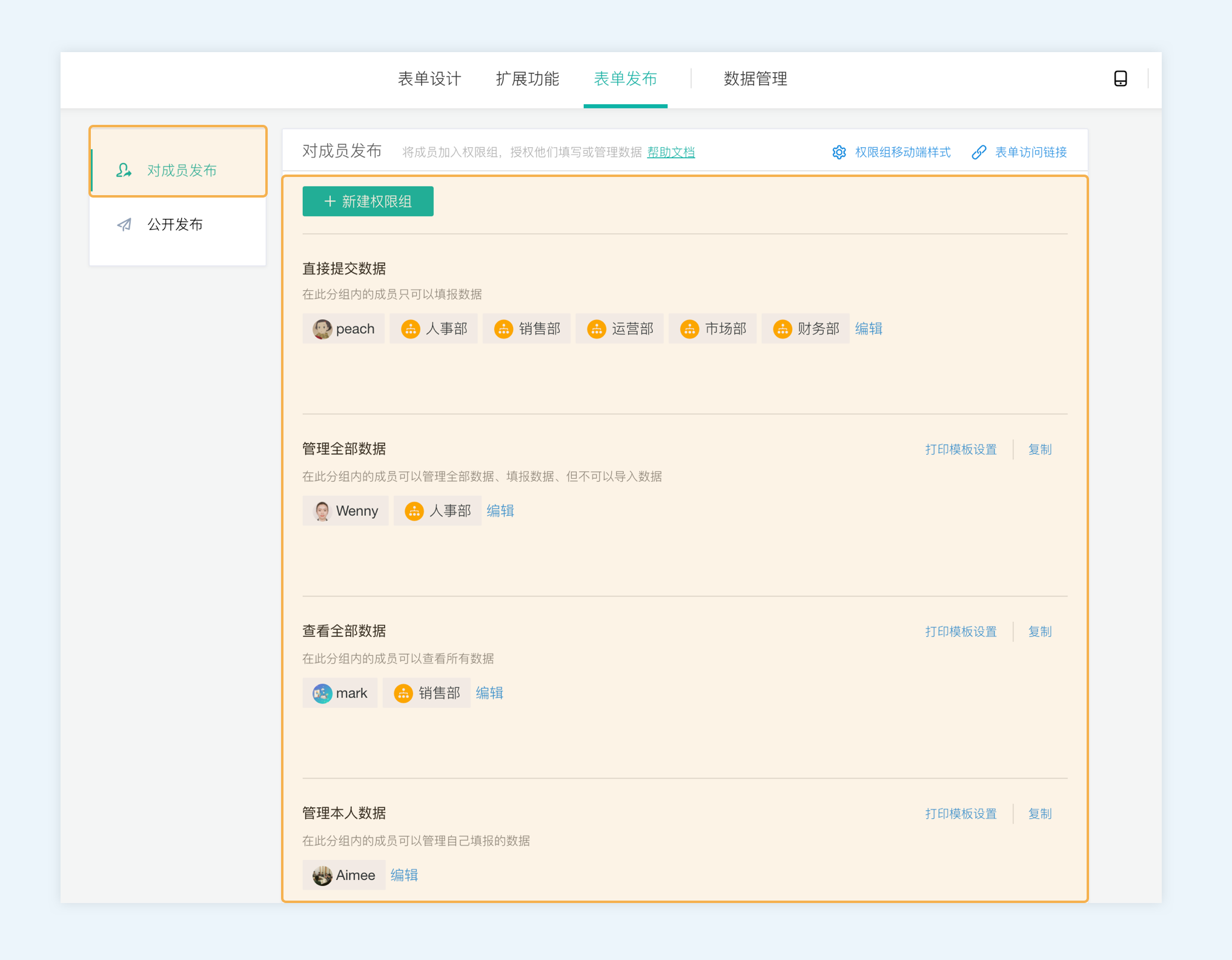 如,部分表单,普通成员可以进行数据提交,而部门主管可以进行数据的管理,这一系列操作都可以通过设置权限来解决。