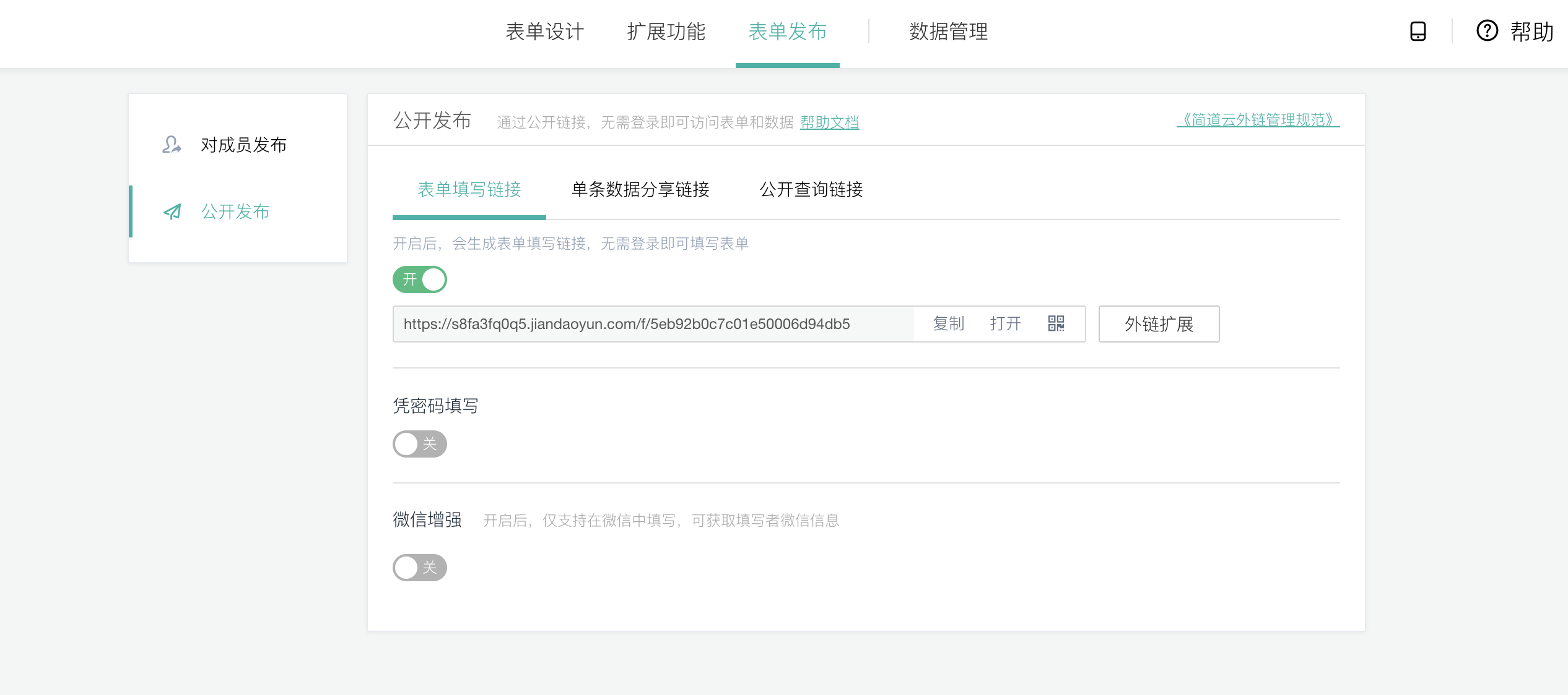 选择公开发布,那么用户无需登录即可访问表单并提交数据。根据实际业务,还可以设置公开查询链接,让外部用户通过查询条件查询提交的数据等。