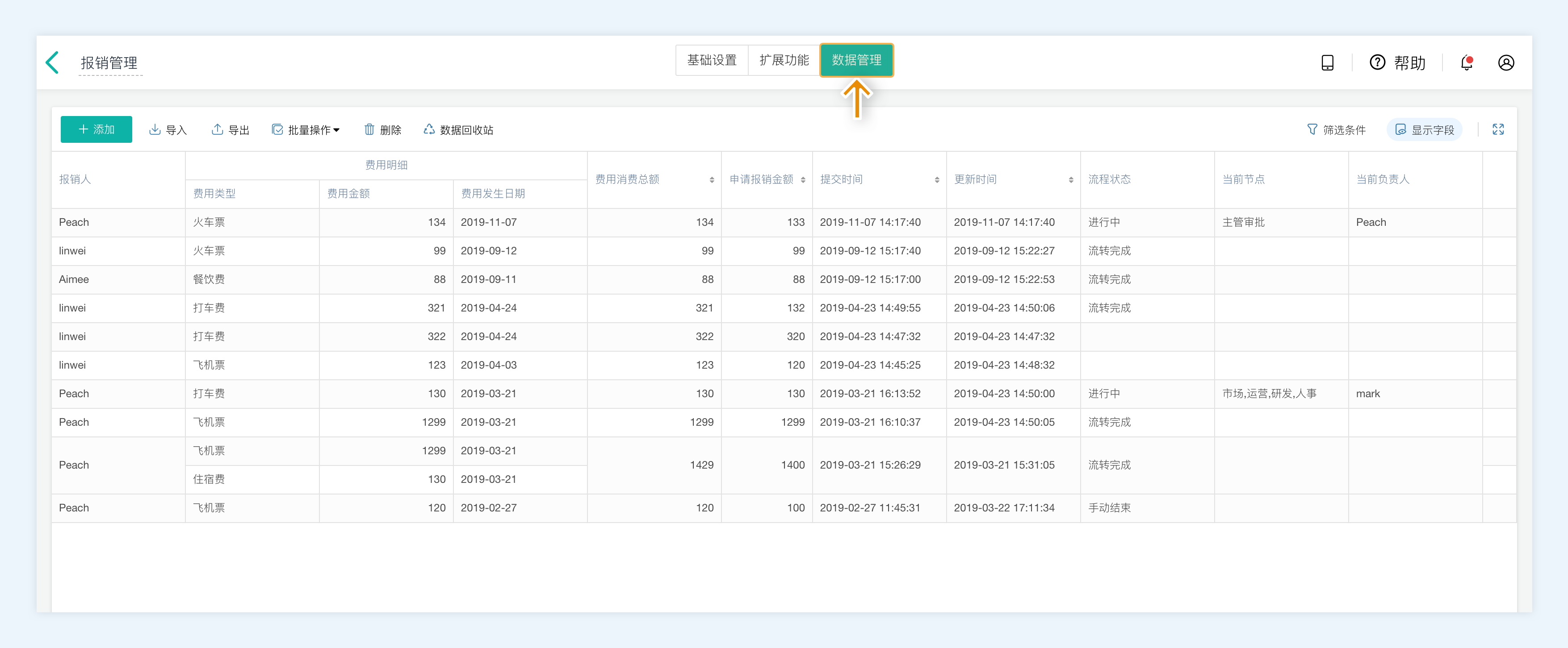 在后台的数据管理中,管理员拥有所有的权限。可以直接添加或导入、导出数据,编辑、删除、批量修改数据。也可以对数据进行筛选查看。而普通成员则只能查看编辑个人的数据: