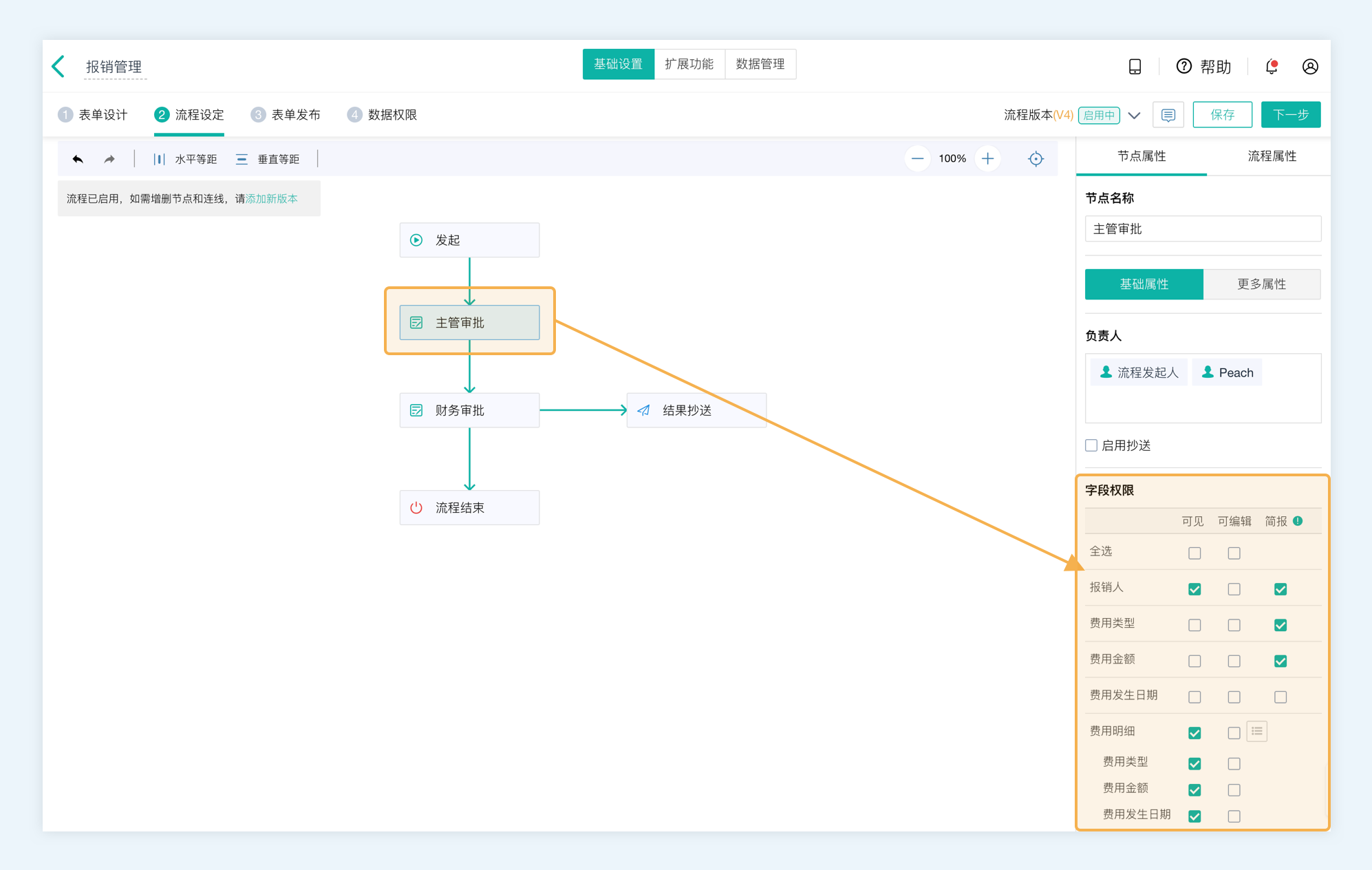 如果涉及到流程配合,在表单的流转过程中,可以对该节点负责人在处理待办数据时的操作权限进行规定——字段是否可见,是否可编辑,以及简报字段。
