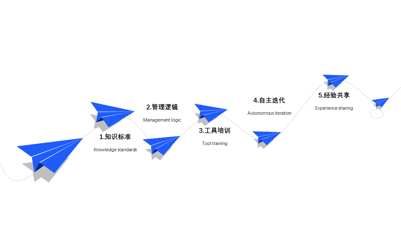 【赋能载体】:如何构建企业的业务自驱能力平台,参照先驱者的经验,需要有一个过程的,其中包括知识标准、管理逻辑、工具培训、自助迭代、经验共享五个步骤。