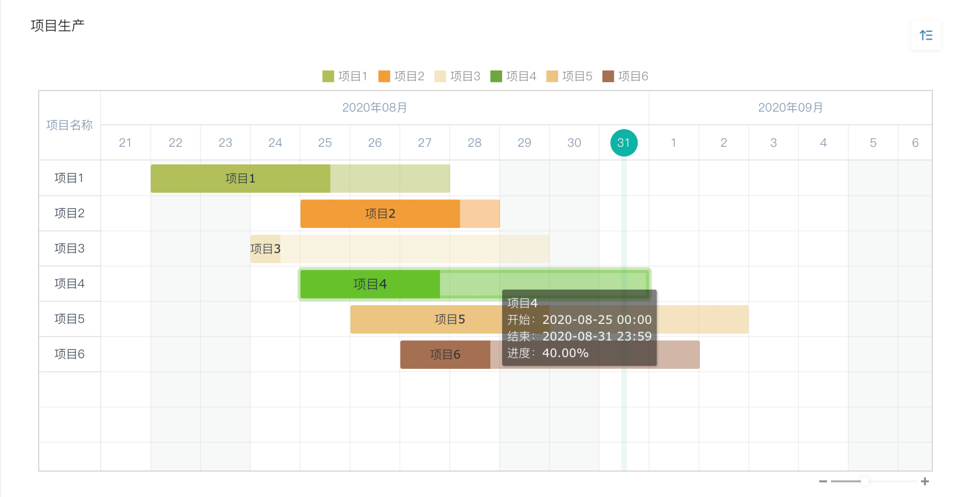 是项目/任务管理中非常常用的一种图表类型,以图示通过活动列表和时间刻度表示出特定项目的顺序与持续时间。