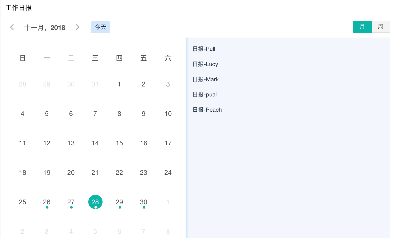 成员在访问日历组件时,有数据的日期将会有小圆点提示。点击可以看到该日期下的所有数据,点击单条数据标题可查看详情。