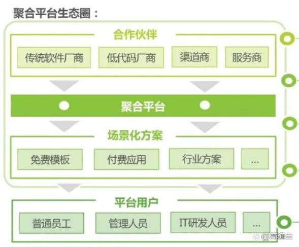 目前,越来越多的低代码厂商入驻互联网巨头的聚合平台,通过API接口开发平台能力,形成以聚合平台为中心、低代码厂商围绕的生态圈。
