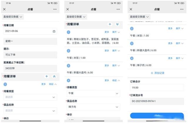第二步:创建菜谱录入表单——在订餐表单上进行最后截至时间的判断,在有效订餐时间内方能提交用餐订单。