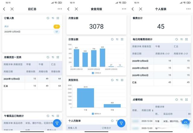第三步:自动生成报表——充分利用简道云的仪表盘,生成食堂日汇总,月报表,各人报表,方便食堂统计第二日用餐人数,各菜品的订购数量以及各人的订餐详情。而个人月报和食堂月报,自动进行月度消费统计,将每餐刷卡,改为每月刷卡,极大的方便了职工用餐。