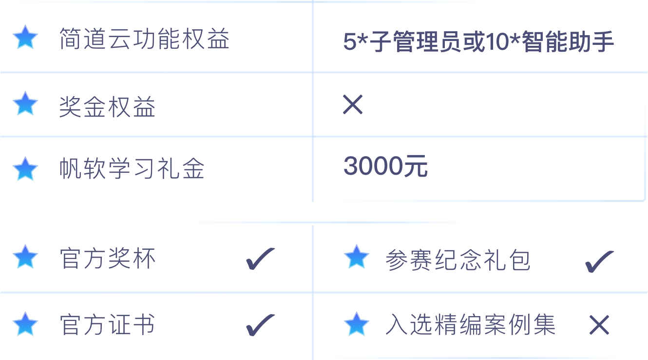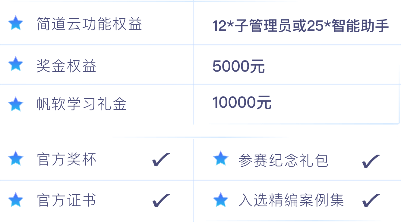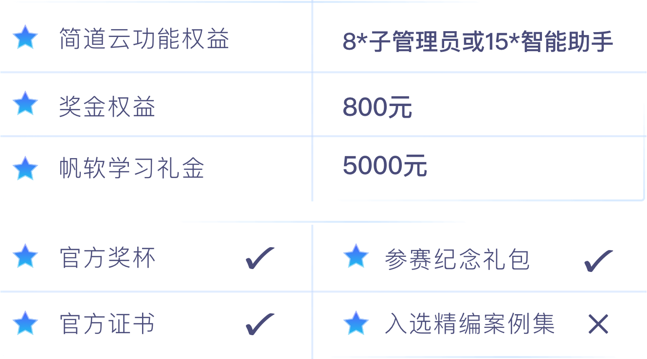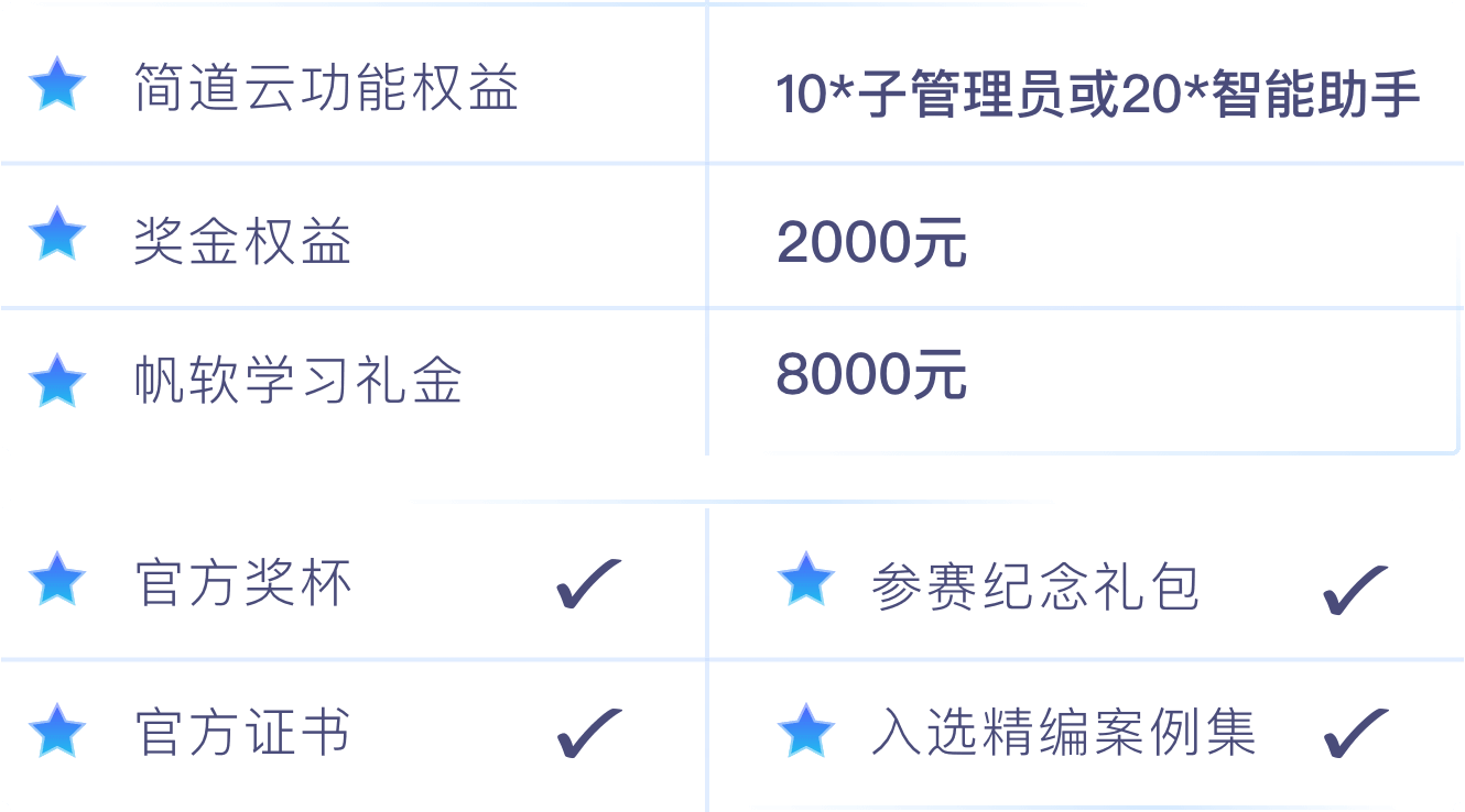 4.参赛纪念礼包:案例成功提交,即可获得参赛纪念礼包,包含简道云出版书籍*1、简道云笔记本*1、简道云周边1套