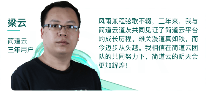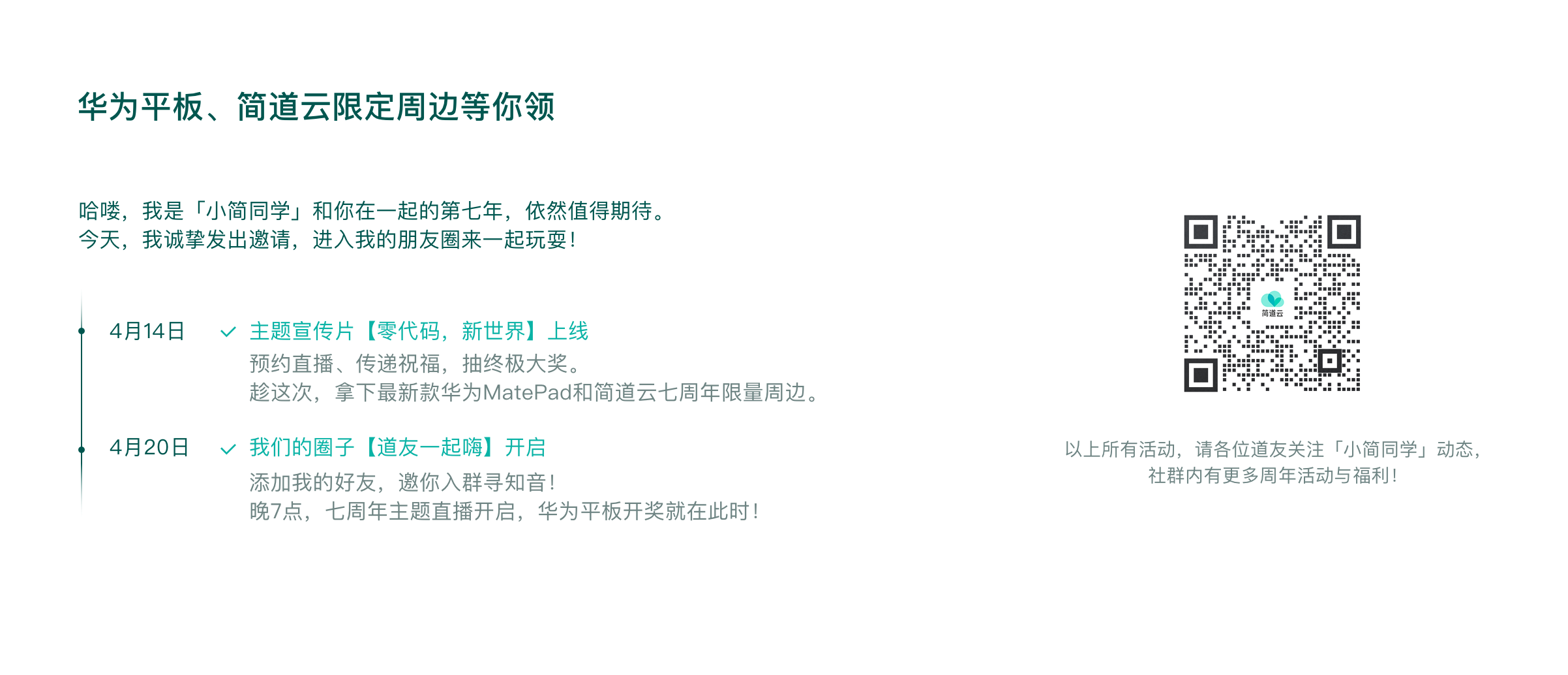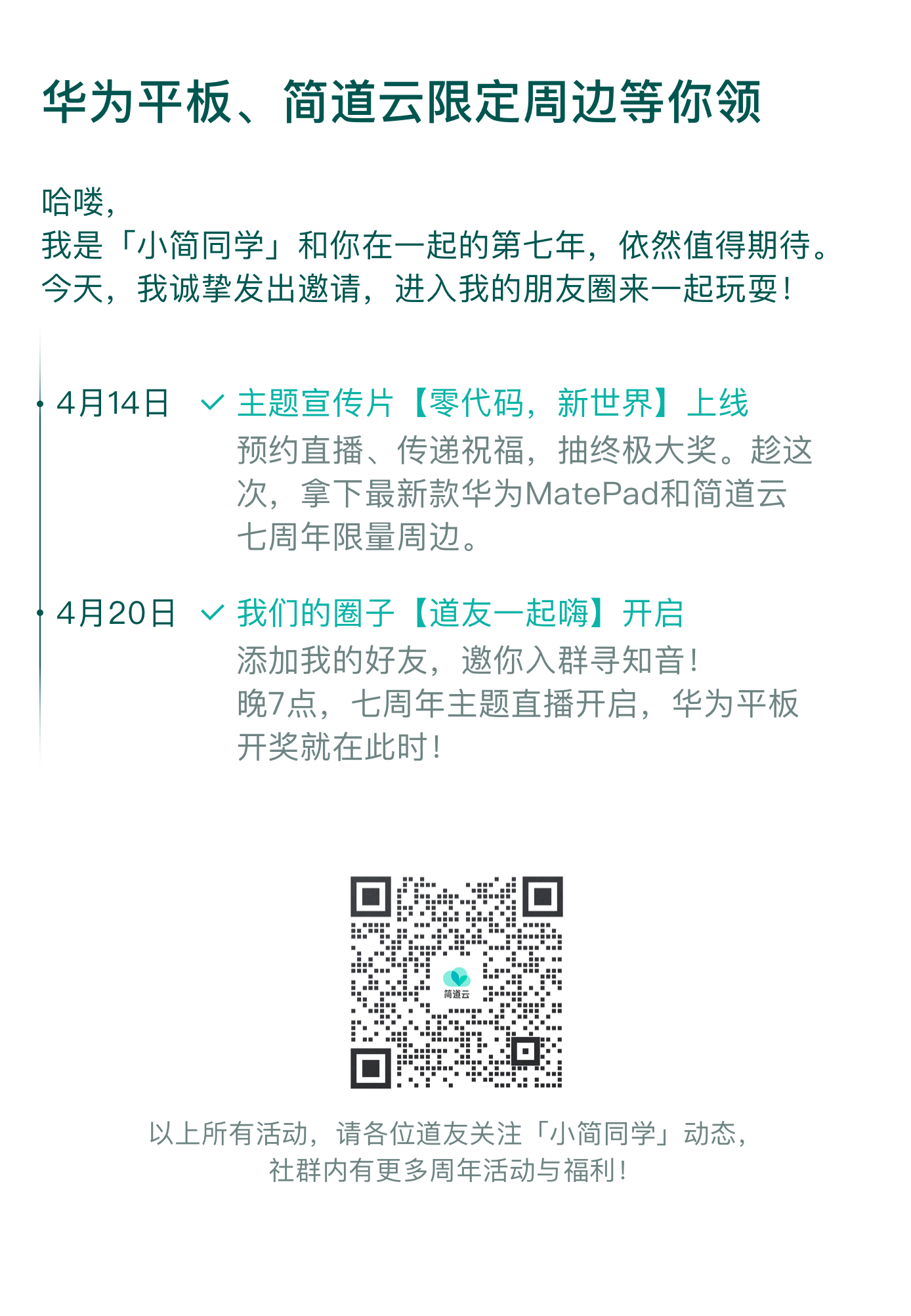 岁月如流水,又逢四月时,简道云即将迎来第七个生日。七年里,已经有超过1600万简道云用户搭建了超过260万个应用。我们始终认为,一群人的创新才能成就时代的创新, 每一位零代码开发者都是整个数字化浪潮中的主角。今年,我们将帮助更多不具备IT专业背景的开发者,让更多人有机会体会到零代码开发带来的无限可能。相信“全民开发”这股力量参与的数字创新,一定未来可期!