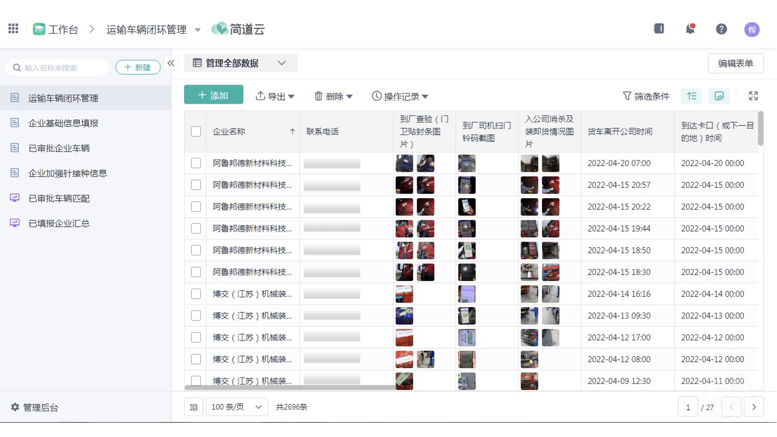 是本轮疫情爆发之后,夏港街道使用“简道云”系统搭建的办公自动化管理平台,从而对出入企业的货运车辆做到精细管理。当下疫情形势复杂,管理外来货运车辆是基层防疫的一大重点。