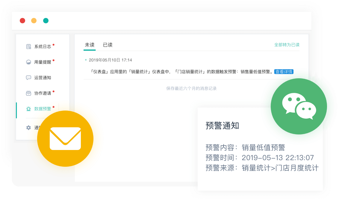 通过预警设置,当数据异常时(如库存不足),将第一时间向负责人推送消息。