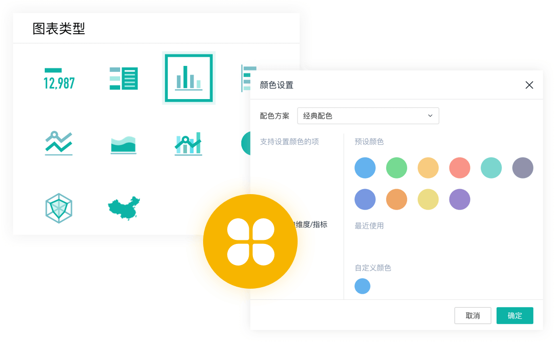 多种配色,完全自定义设置,让你的仪表盘与众不同,独具特色。