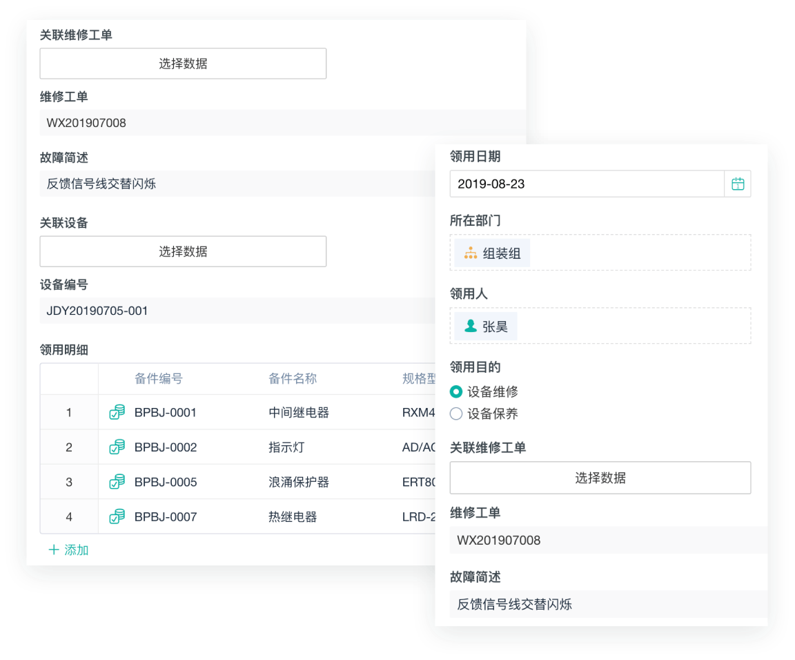 设备基础信息 + 点检记录 + 维修记录 + 保养记录 + 备件更换记录 + ……