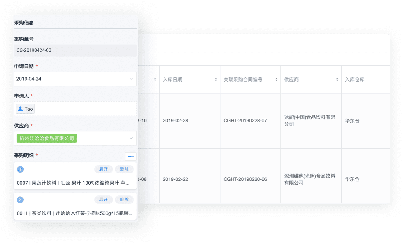 - 从采购申请到合同签订,再到入库/退货,都形成一套完整的流程,实现对采购业务的全流程监控。