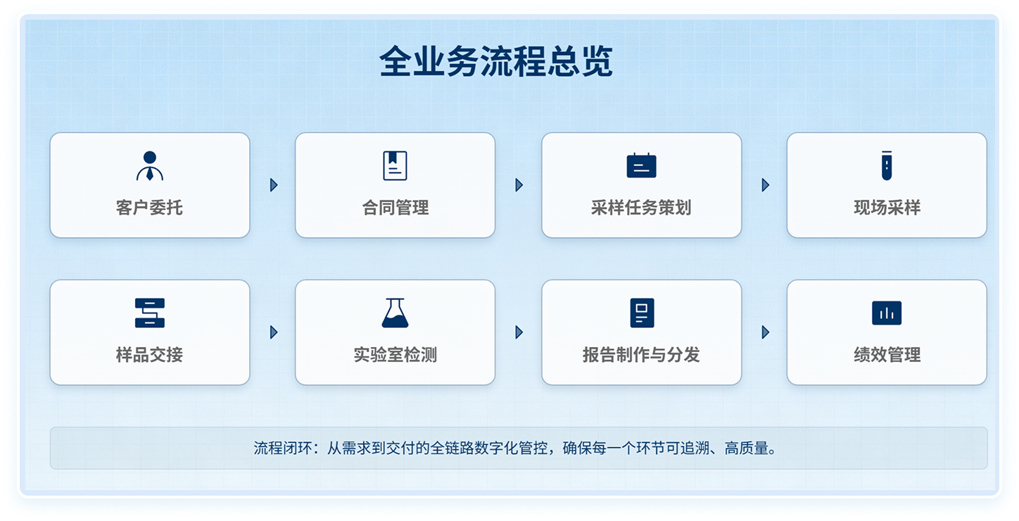 系统打通了从客户委托到最终报告分发的全业务流程,实现了端到端的数字化管理,确保流程高效、规范、可追溯。